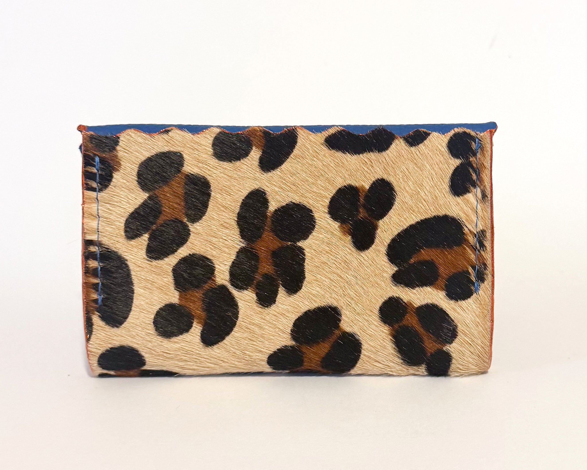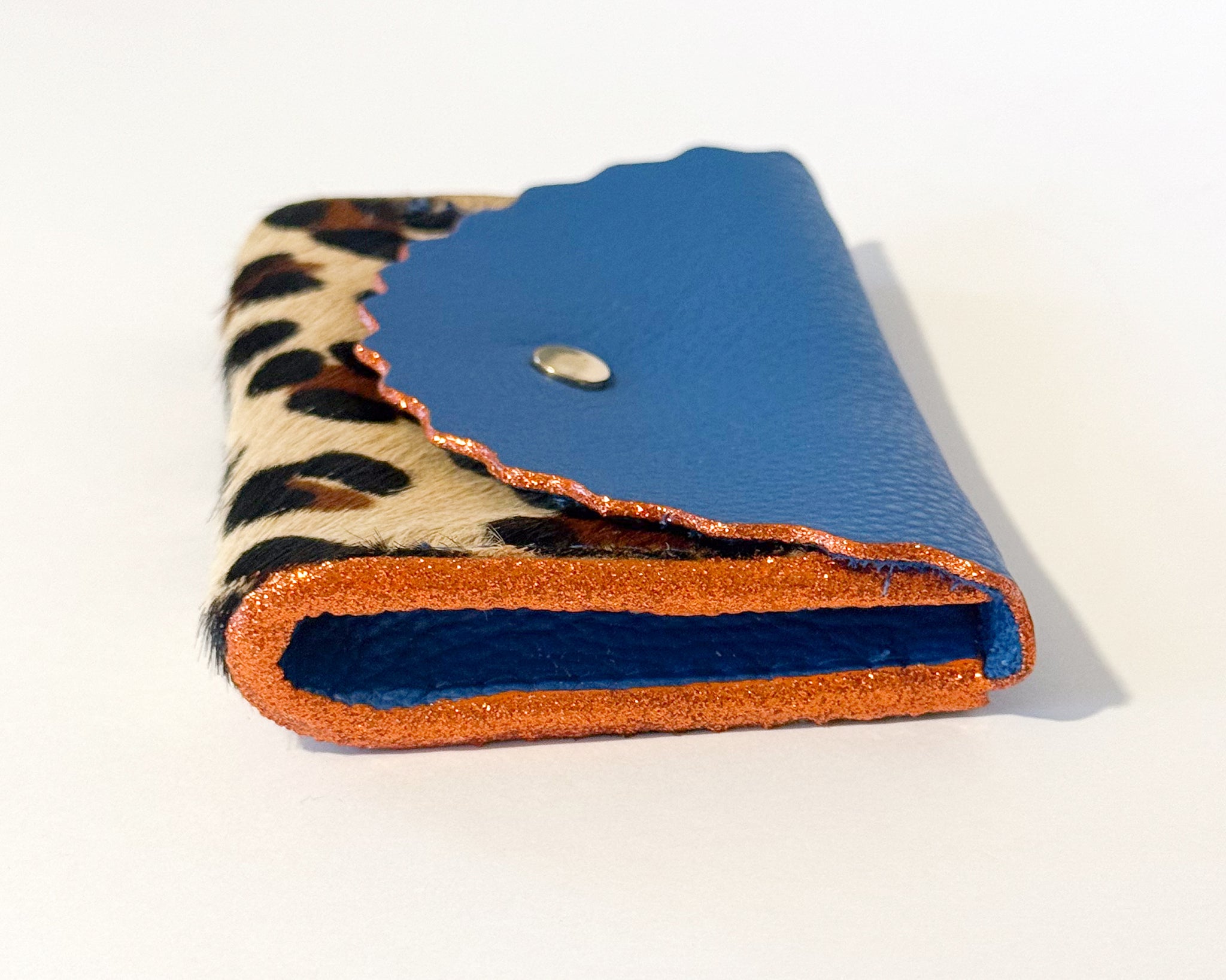 Made from Leopard print hair on hide & cornflower blue leather, with hand painted orange glitter scalloped edges, fastening with a shiny gold press stud.